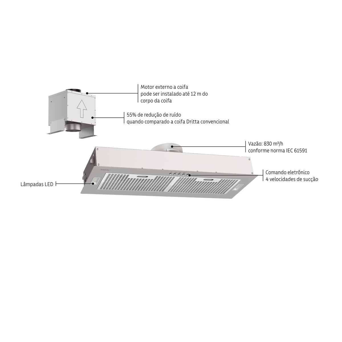 - Performance de sucção elevada: com 830 m³/h conforme norma IEC 61591, garantindo um ambiente sempre limpo e livre de odores indesejados. 🍃