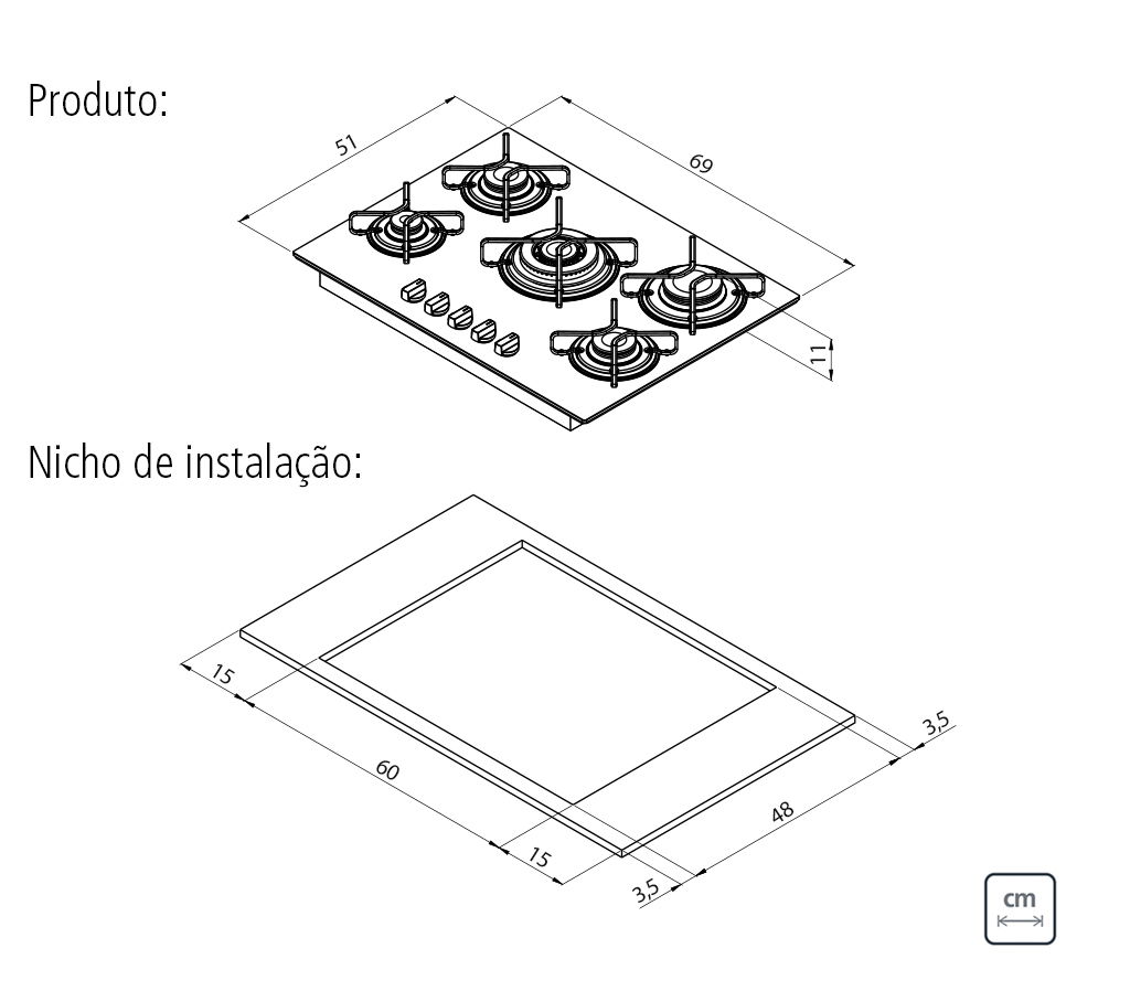 | Nicho para instalação (L x P) | 600 x 480 mm |