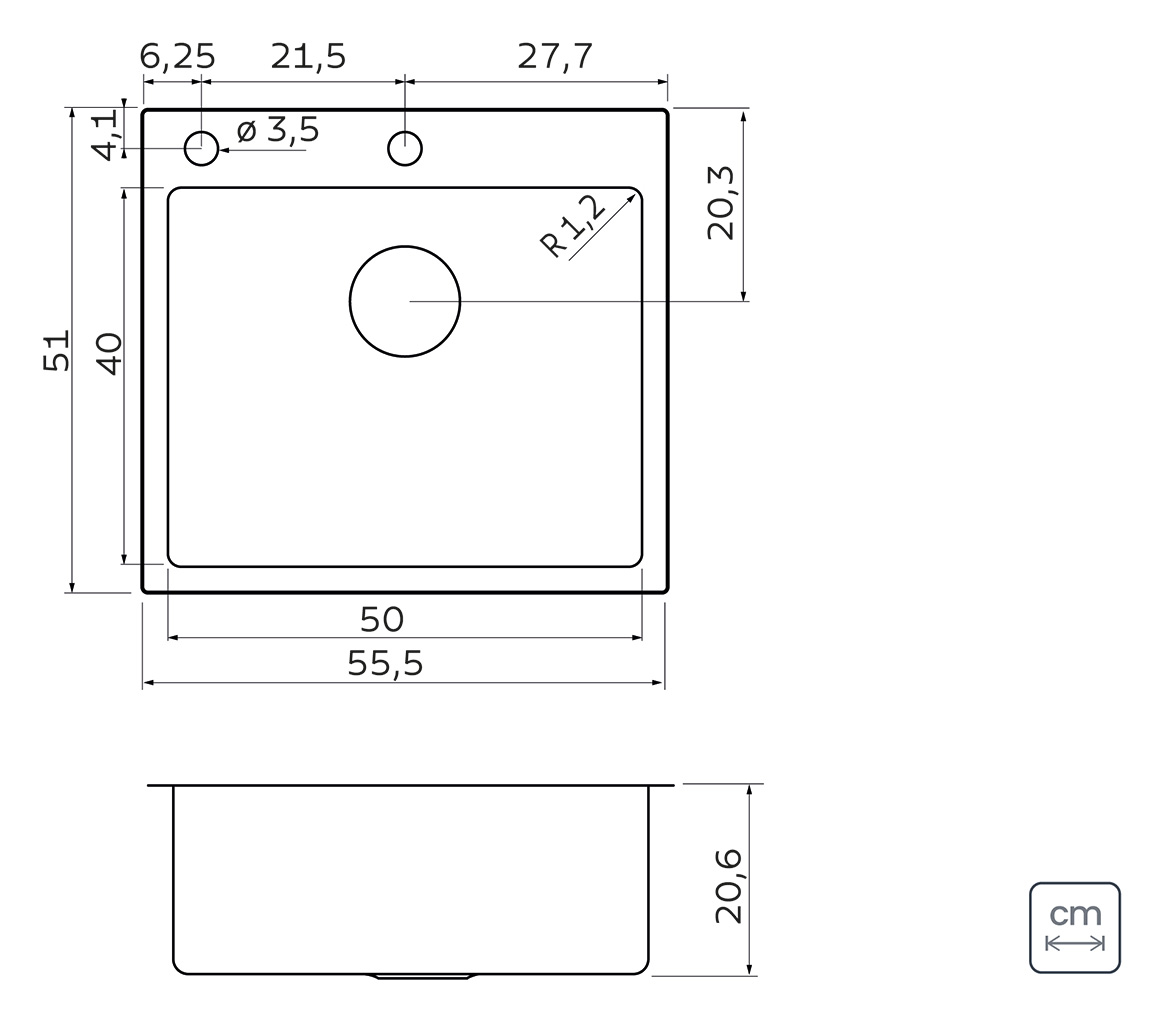 | Cuba em aço inox AISI 304 | Espessura: 1 mm |