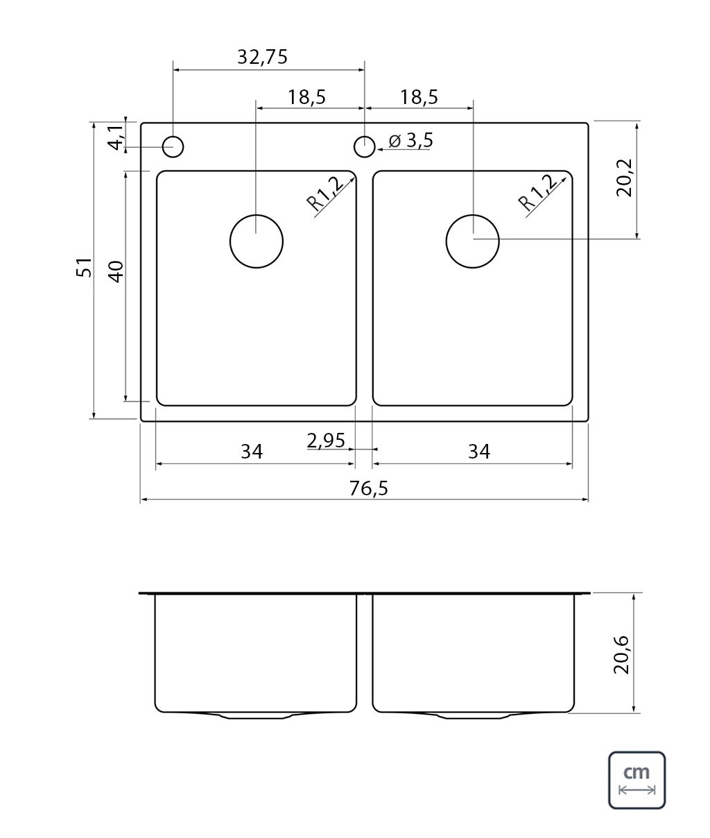 | Nicho de corte | Nicho de corte para instalação da cuba no sistema Semi-Flush: 745 x 490 mm |