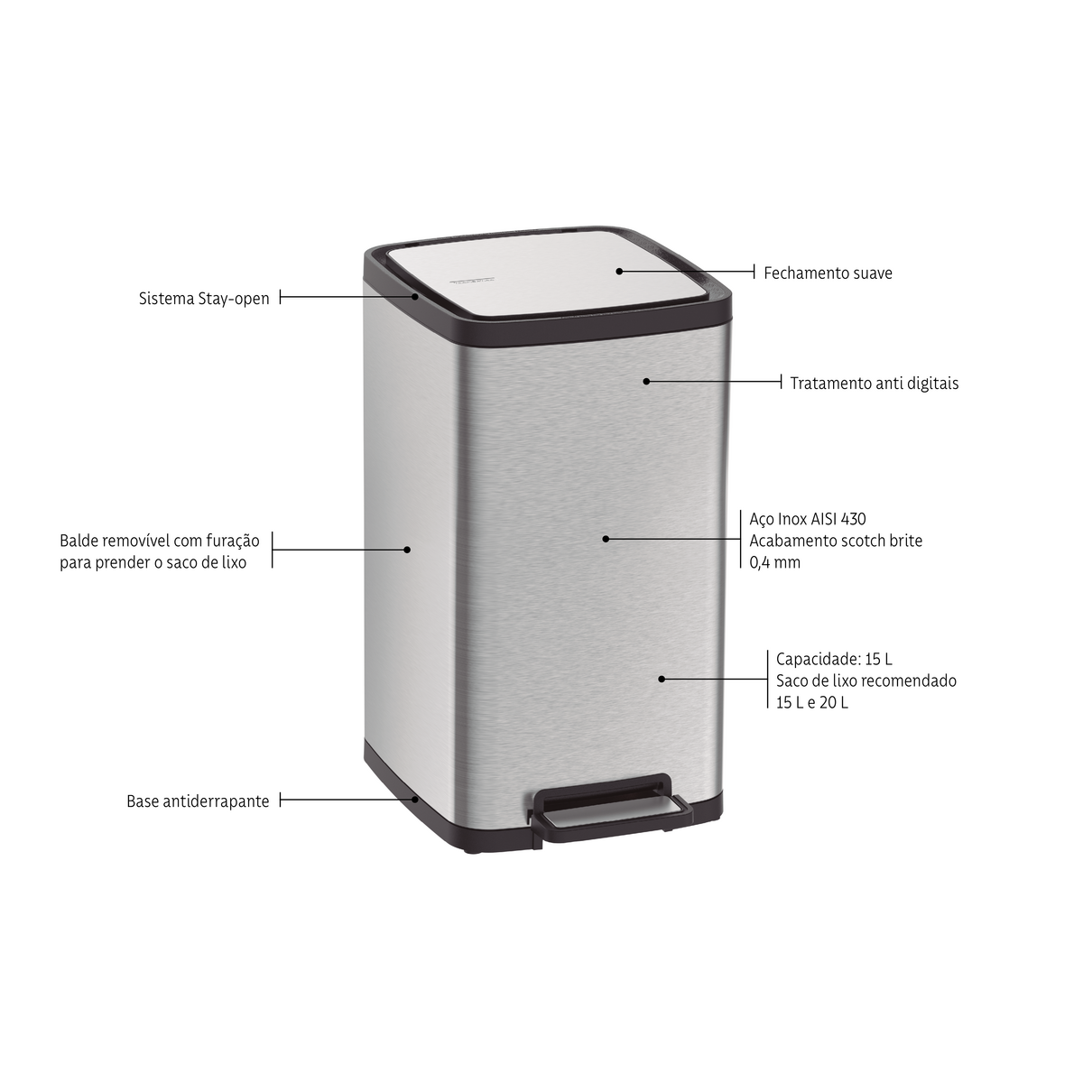 - Tratamento anti digital: Não deixa marcas de manuseio no corpo da lixeira