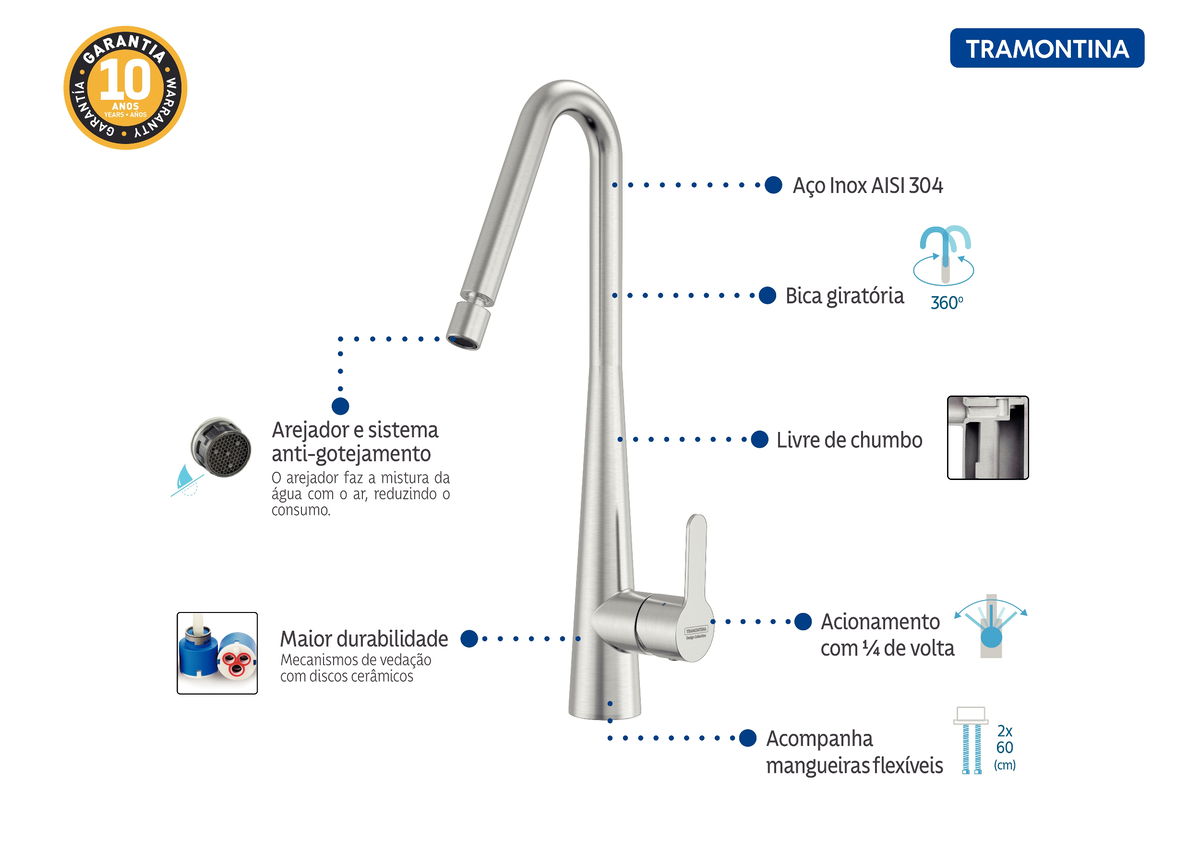 Com design autoral e exclusivo Tramontina, o misturador monocomando Tramontina Graceful em aço inox oferece uma beleza diferenciada e minimalista para sua cozinha. Com rotação de 360 graus e bica articulada, ele garante uma excelente experiência na cozinha e melhora sua experiência de uso. Ele é produzido em aço inox AISI 304, material que garante longa vida útil e é econômico, pois possui arejador que reduz o consumo de água e sistema anti-gotejamento. A escolha ideal para deixar sua cozinha completa, elegante e altamente funcional!
